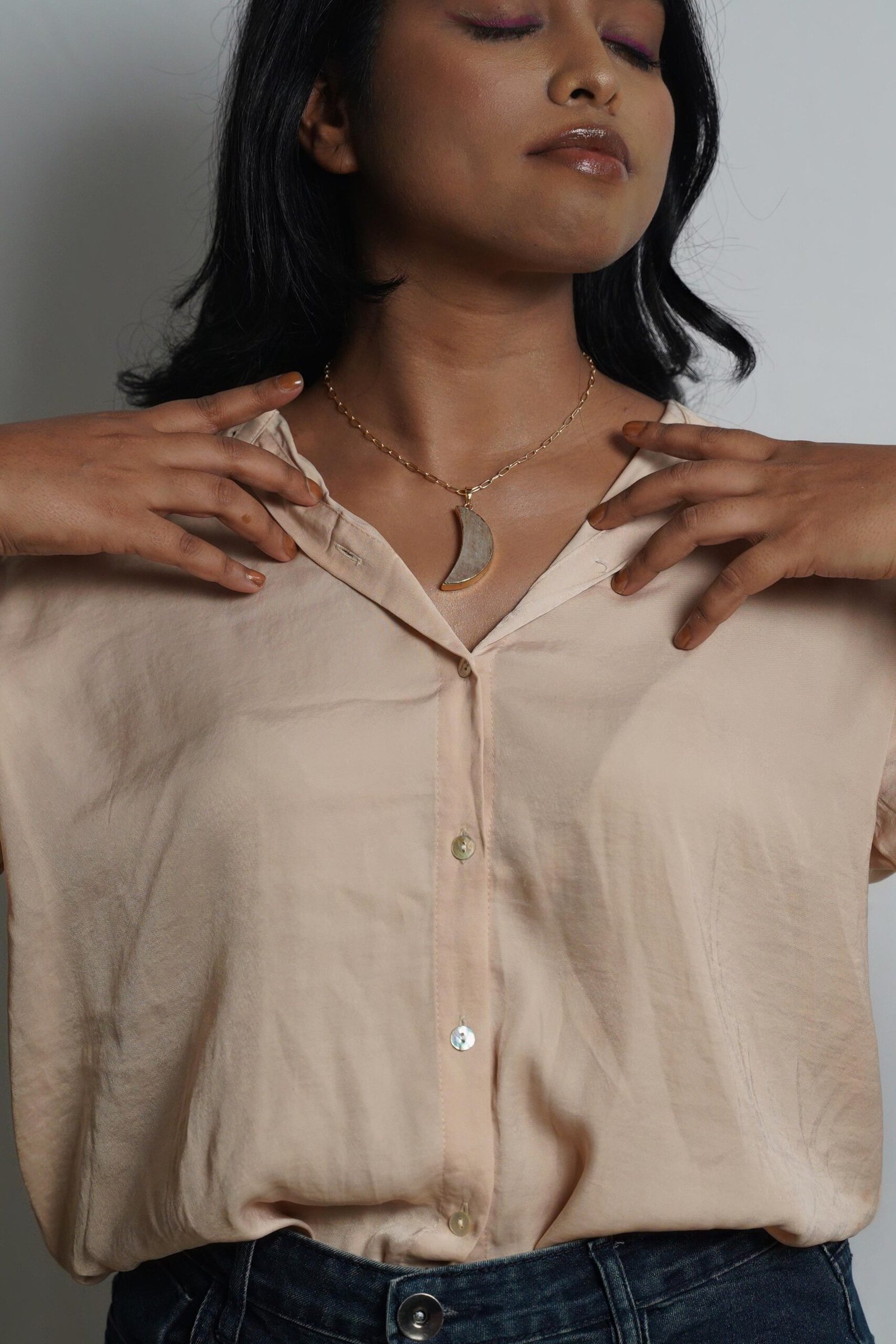 A celestial-inspired half-moon pendant framed in gold, perfect for adding a touch of elegance and mystery to any look. Perfect for layering or as a statement piece.