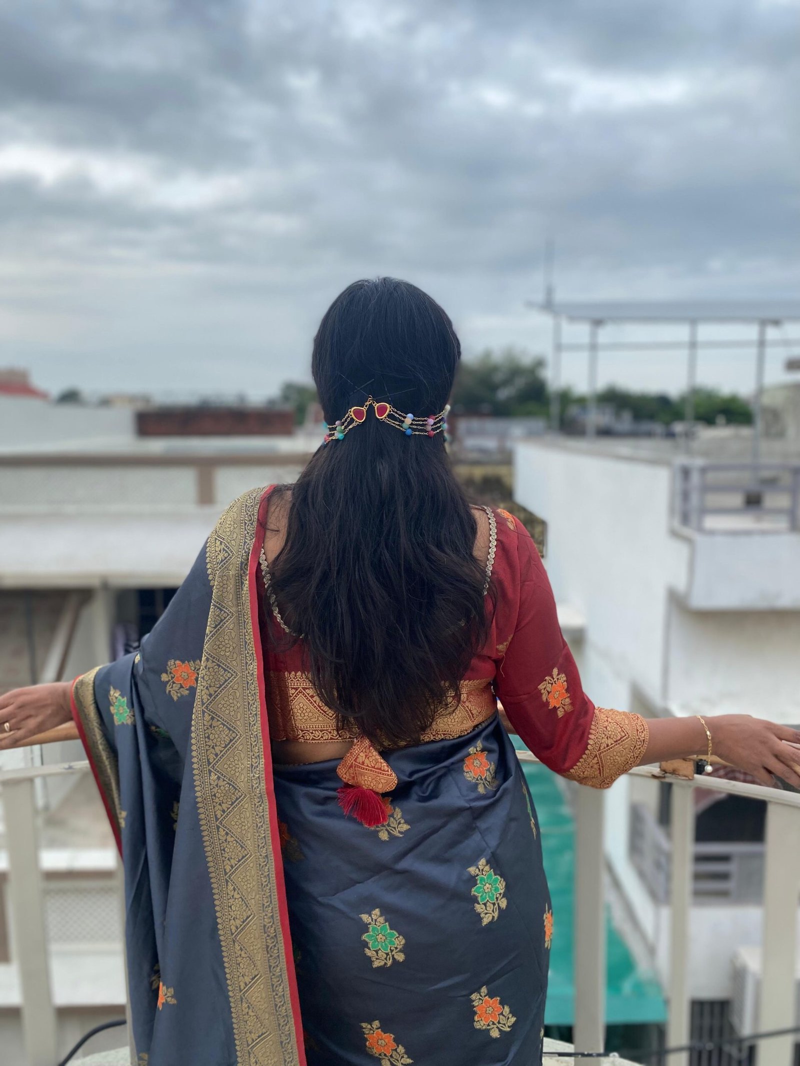These ear cuffs feature vibrant, multicolored beads strung delicately across layers of gold-toned chains, adding a playful and intricate touch to traditional jewelry. The design elegantly wraps around the ear, making it a standout accessory that blends modern style with cultural flair. The bold colors and layered effect create a lively, boho-chic vibe, perfect for someone who wants to make a statement while embracing artisanal craftsmanship. This unique piece is versatile enough to be worn with both traditional and contemporary outfits.