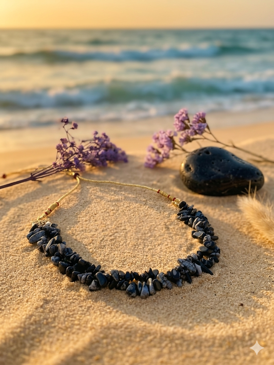 This handcrafted choker features natural deep marble black stone chips, layered to create rich texture and effortless elegance. Designed with warm gold-toned detailing and an adjustable thread closure, it blends earthy beauty with refined luxury.