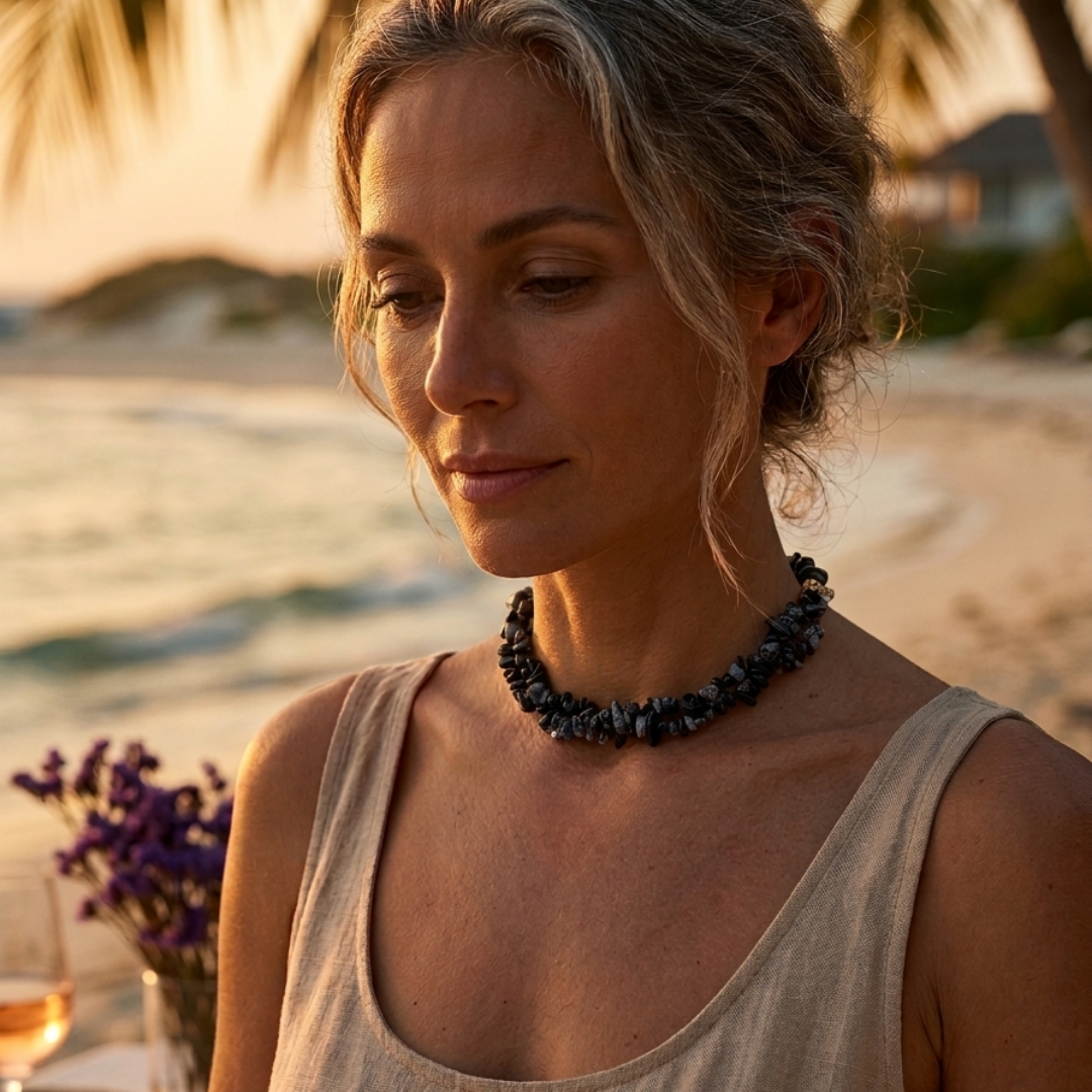 Bold yet timeless, this piece carries the mood of ocean nights, quiet confidence, and elevated everyday styling. Perfect for vacations, festive evenings, or simply making ordinary days feel a little more luxurious.
